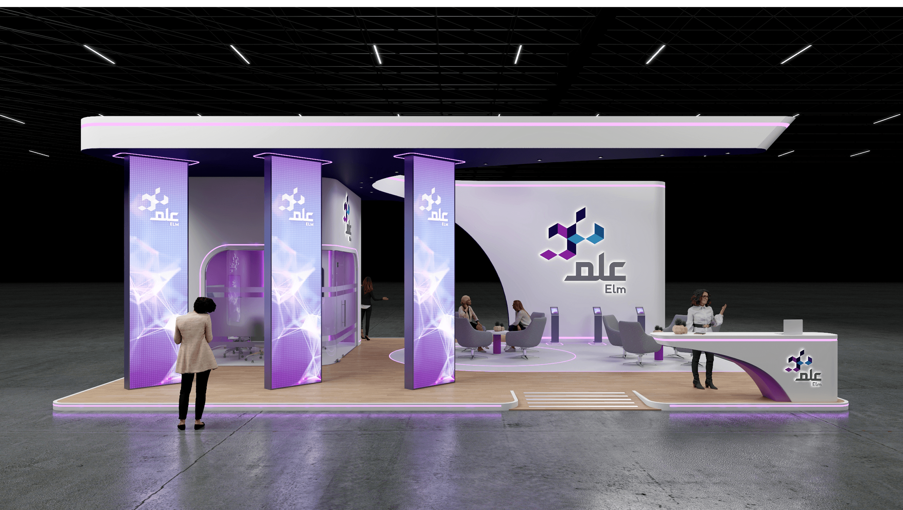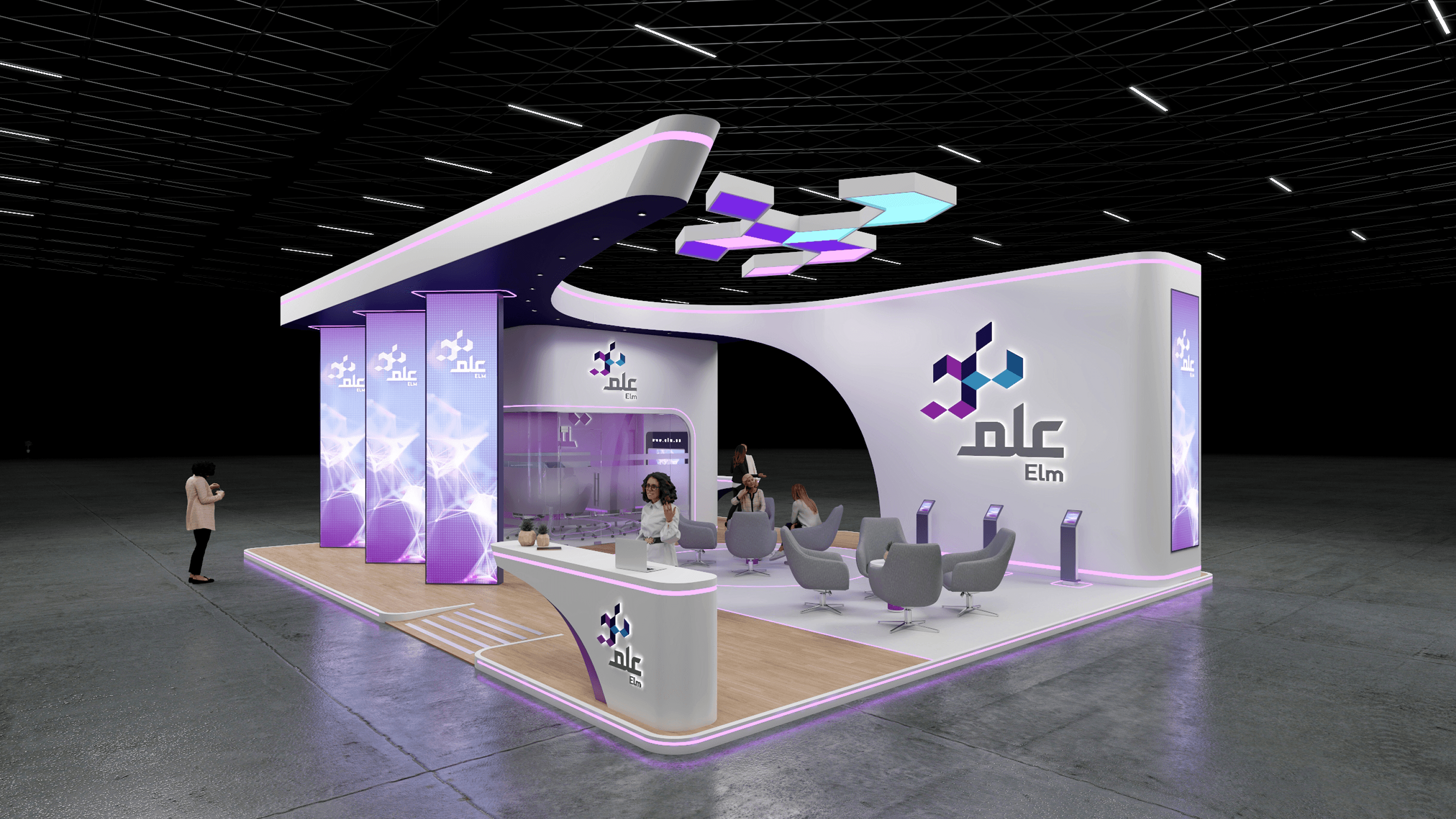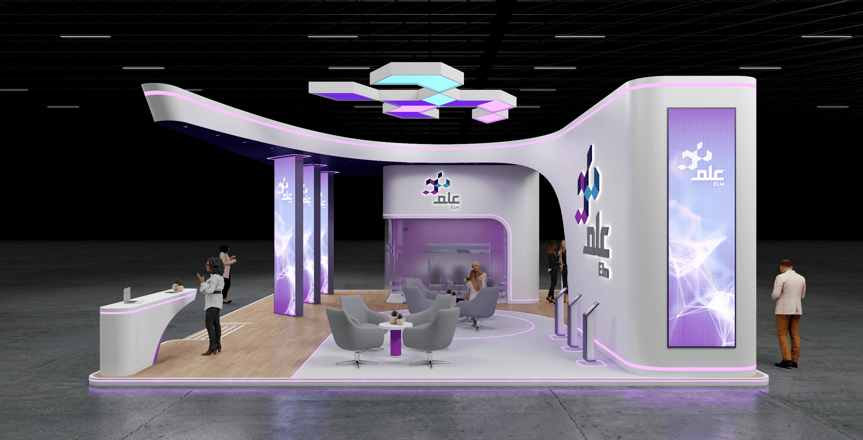 A dynamic exhibition space for ELM, combining technology-driven aesthetics with an immersive and interactive environment