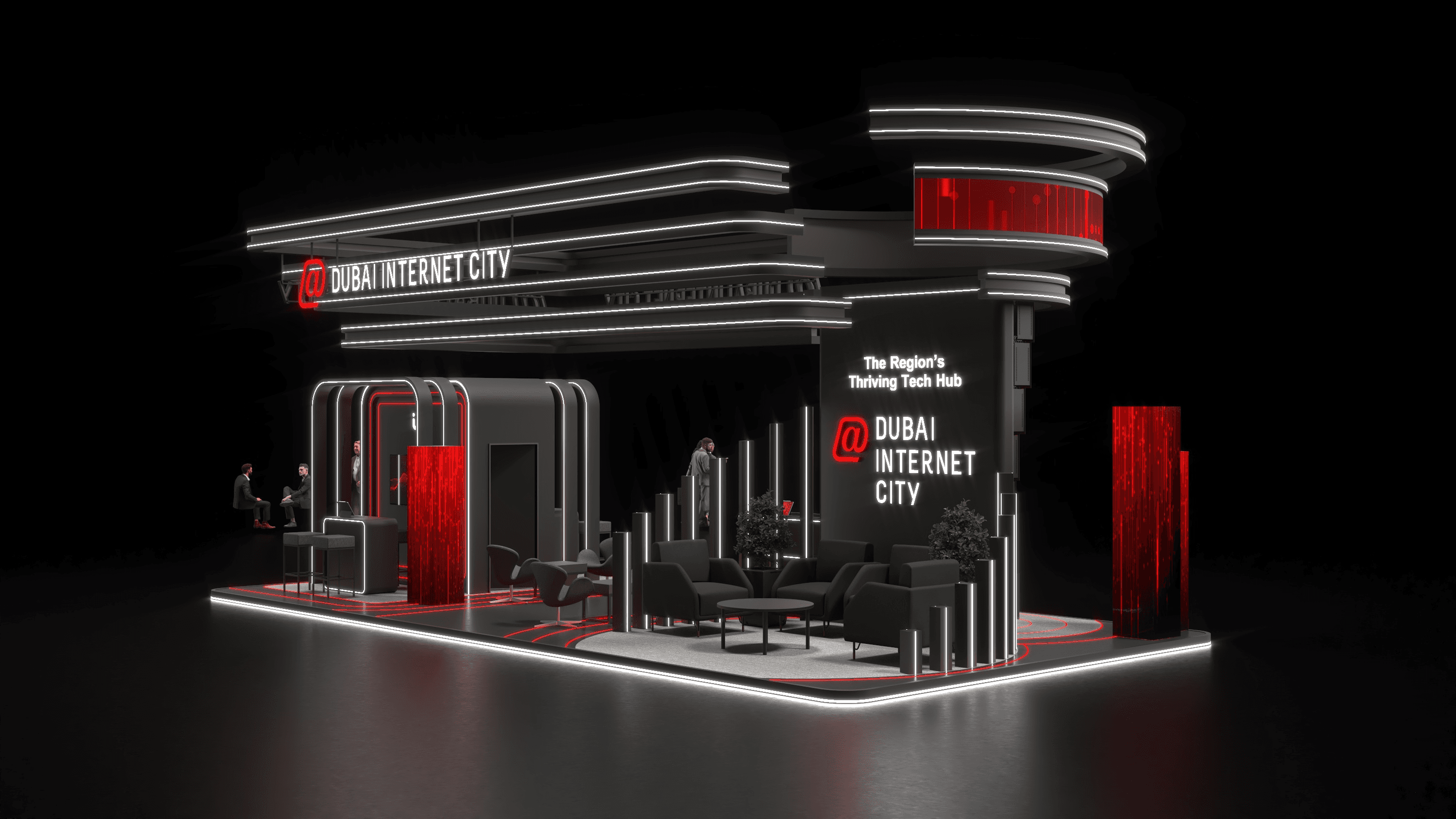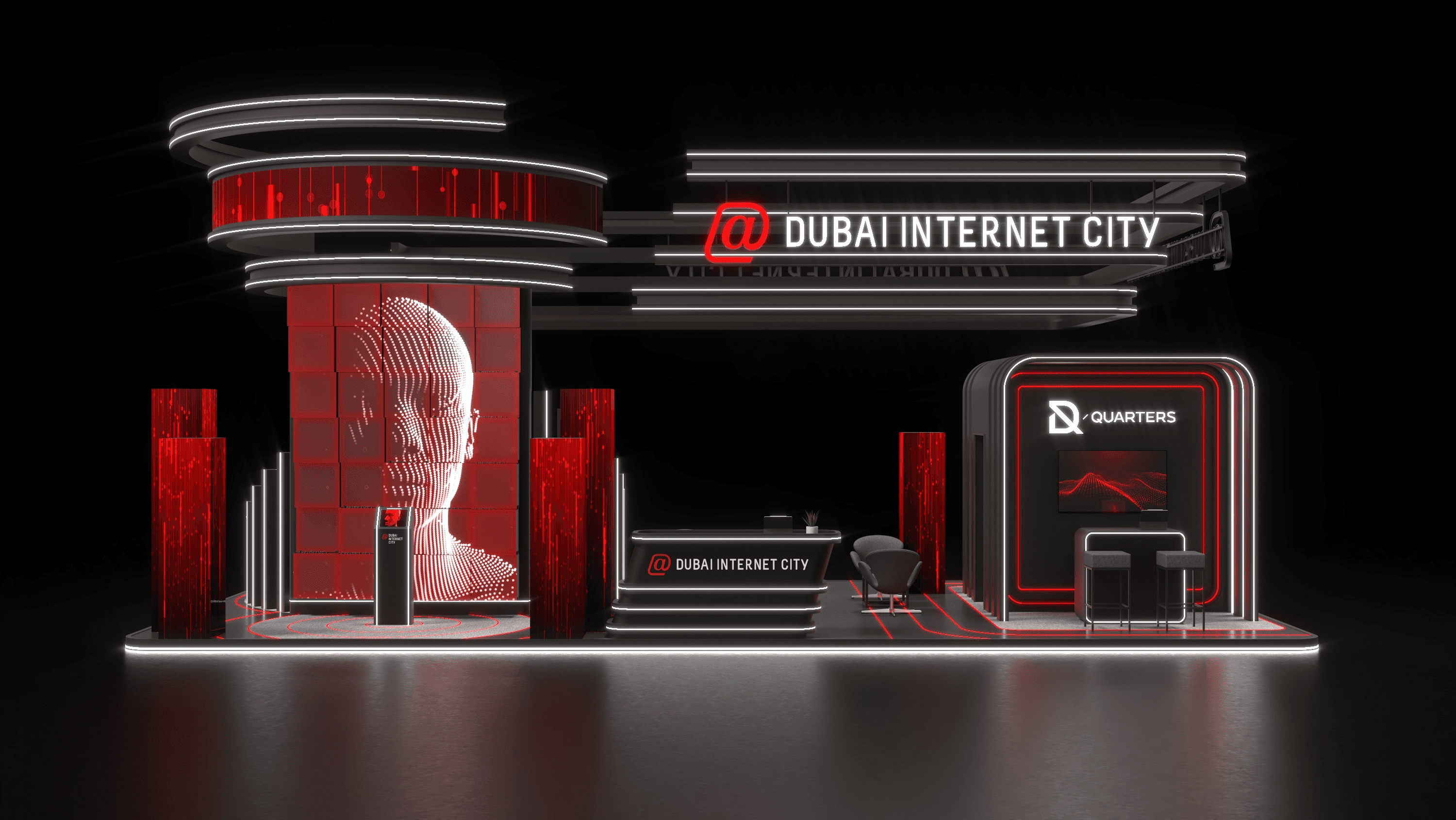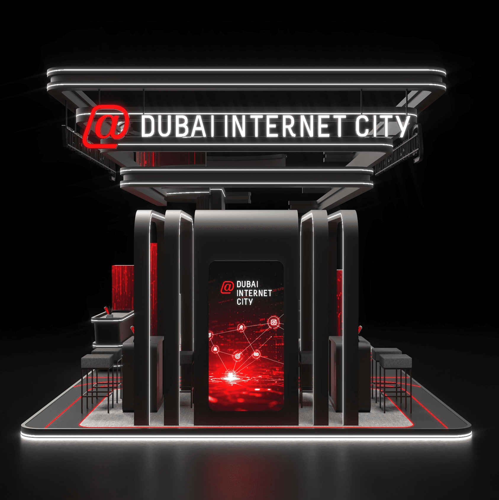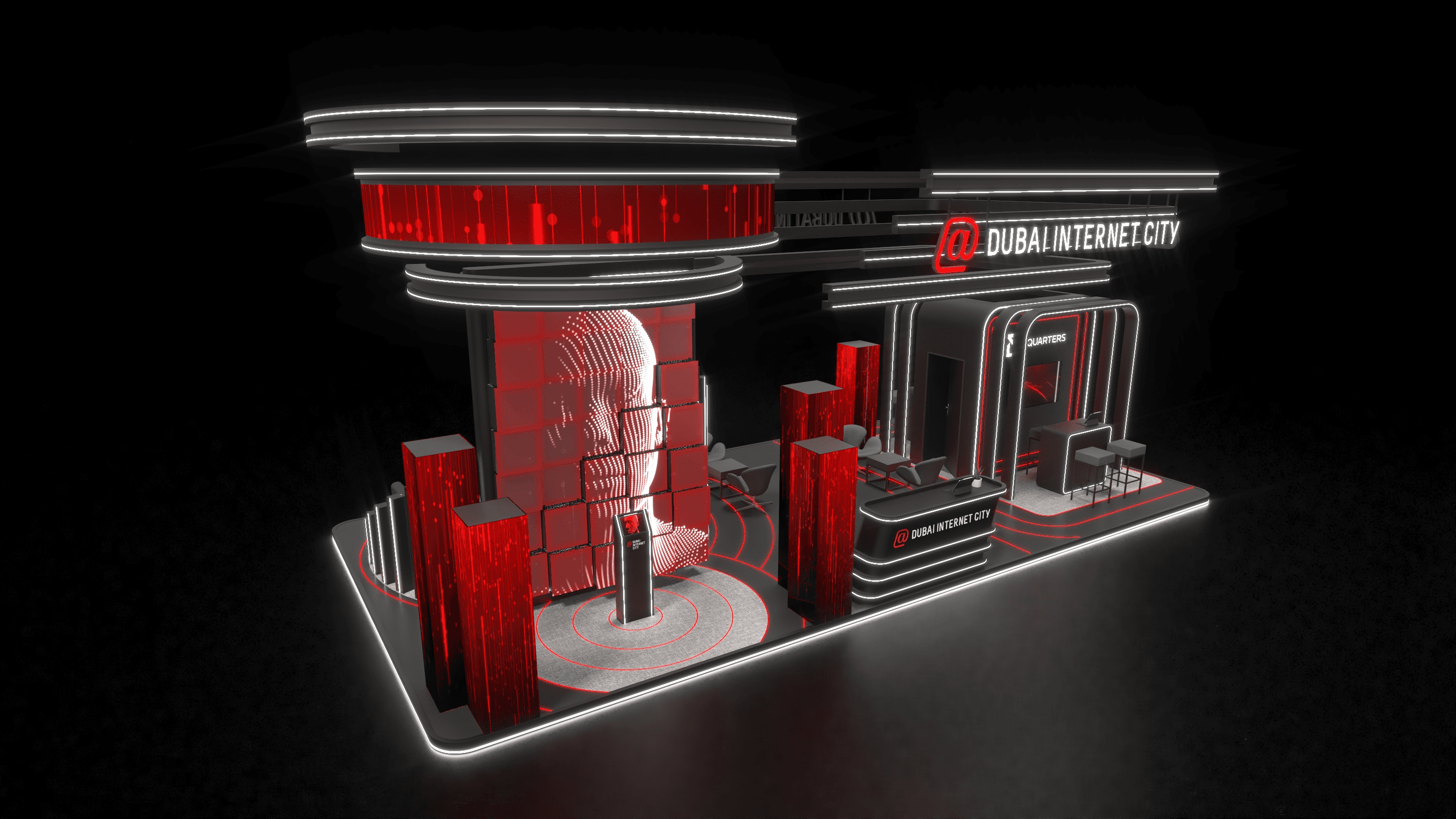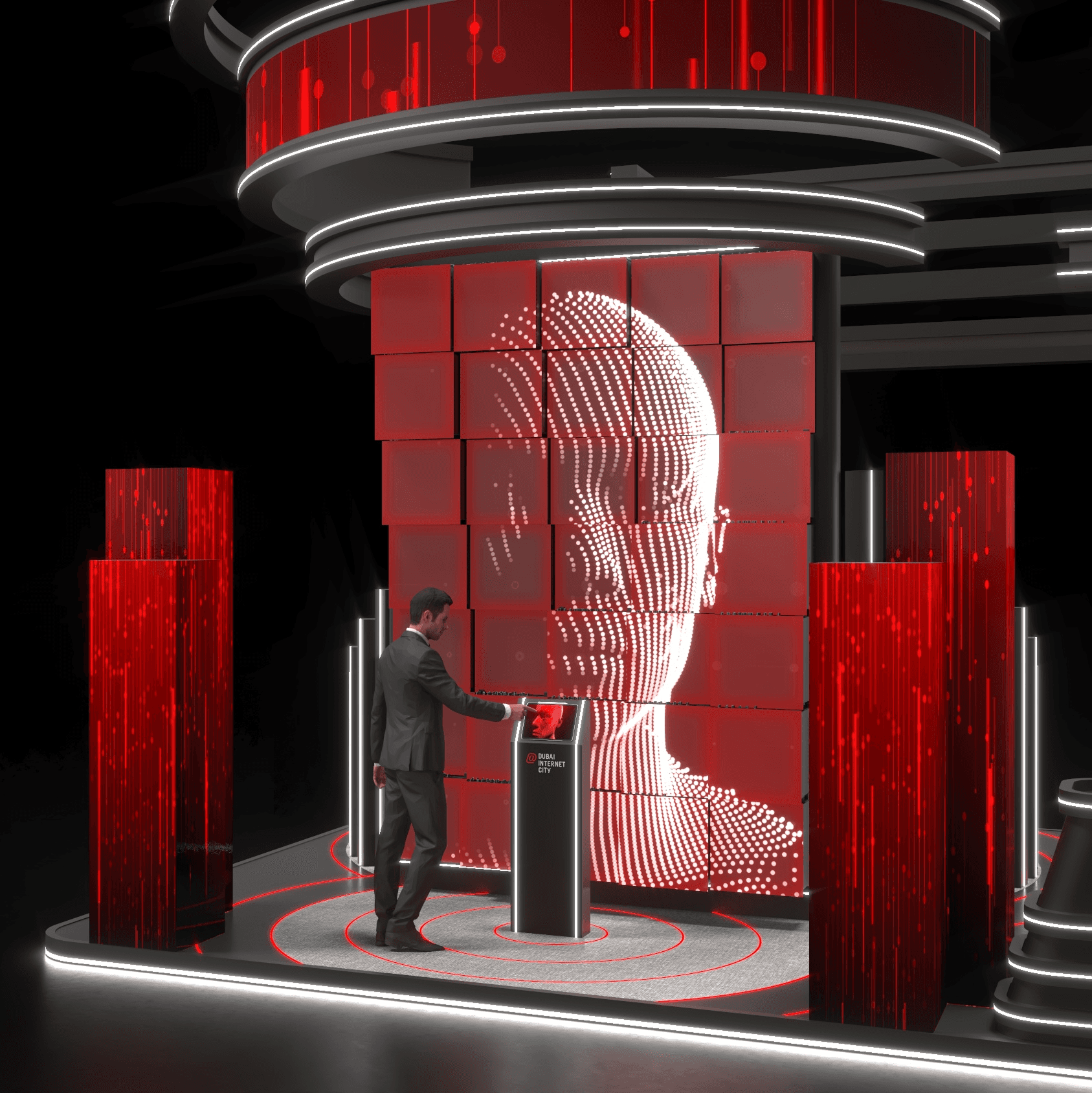 An AI-focused exhibition stand for Dubai Internet City, featuring kinetic LED displays and dynamic visuals that bring motion and technology together in a bold, attention-grabbing exhibition stand