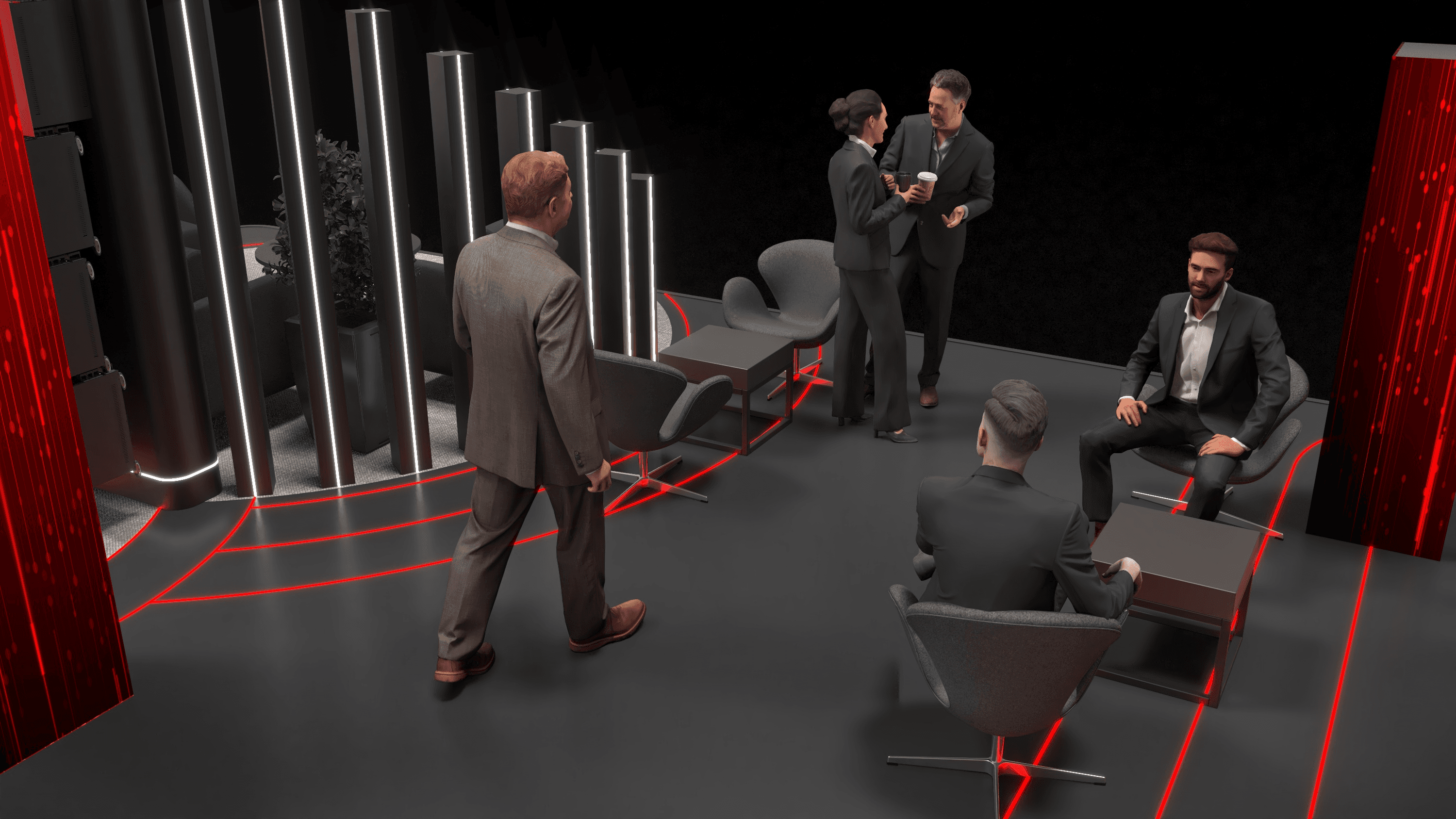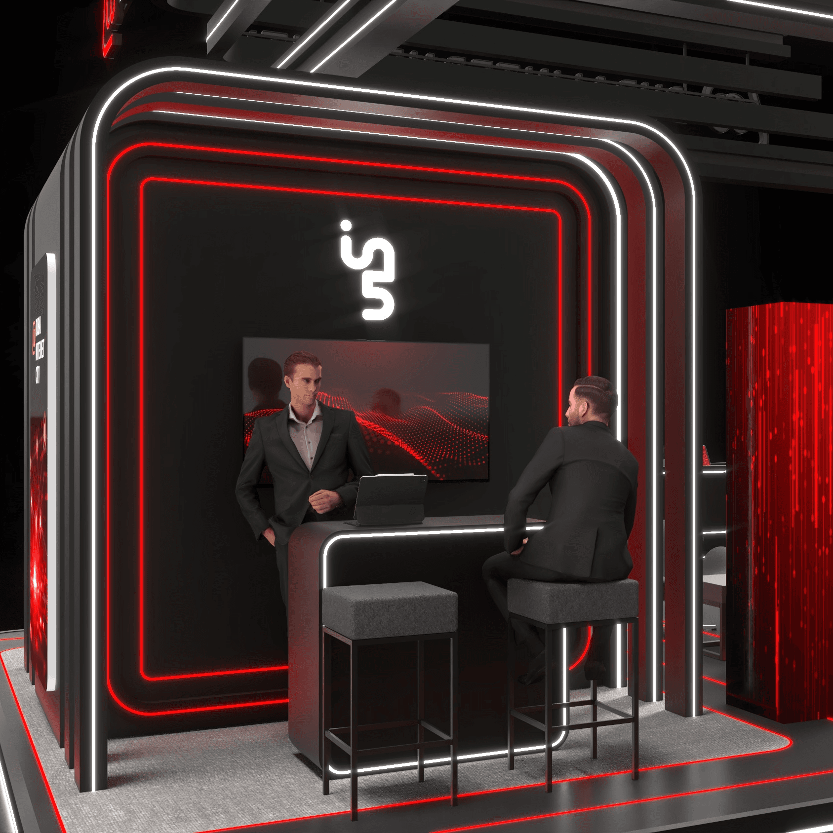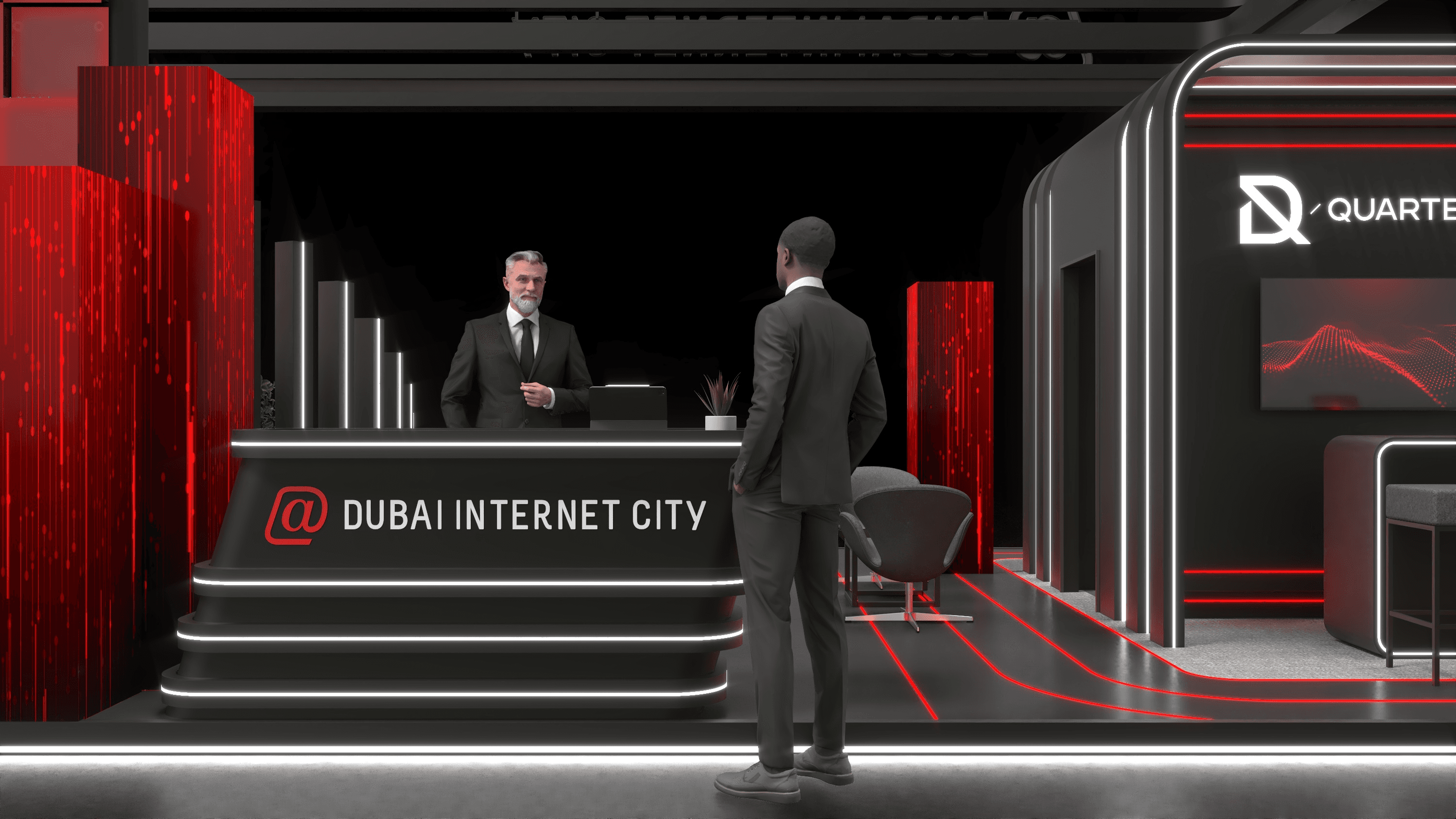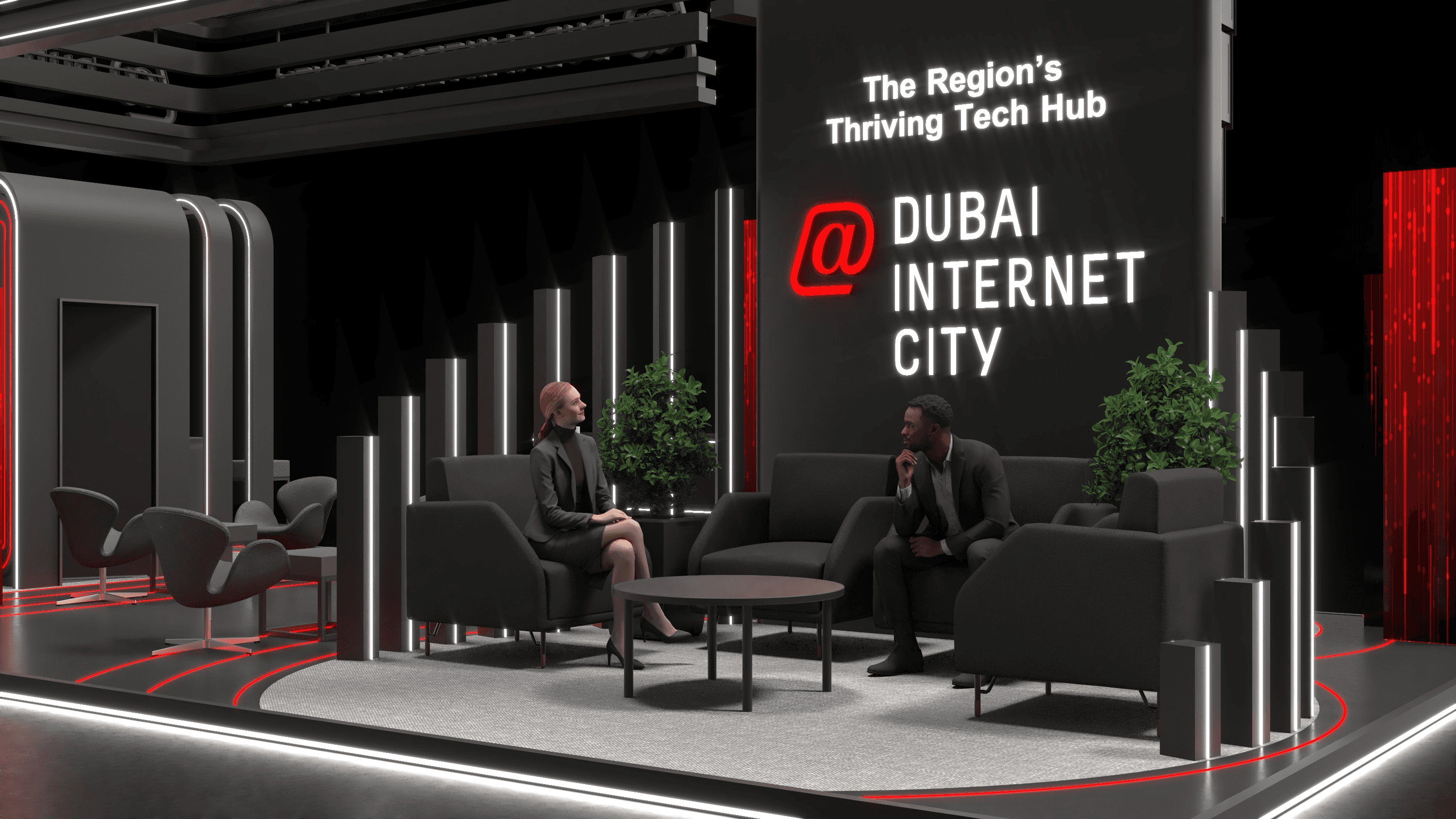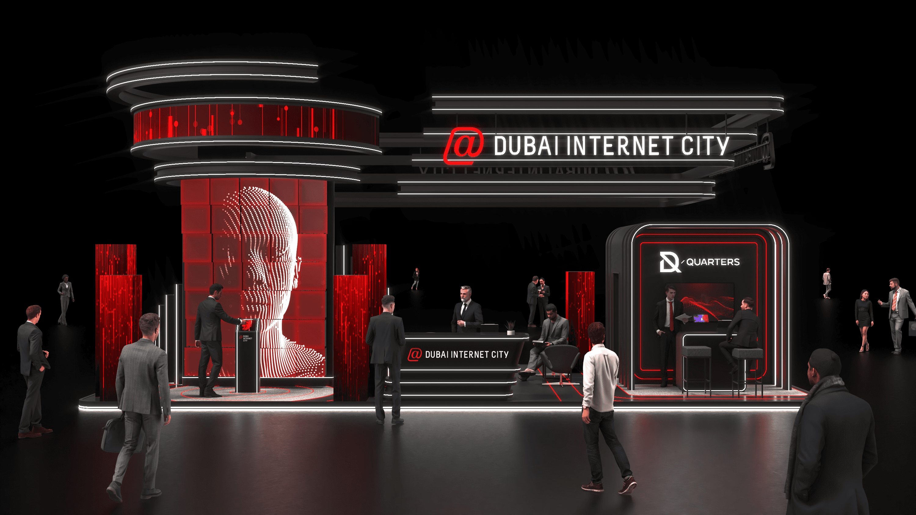 An AI-focused exhibition stand for Dubai Internet City, featuring kinetic LED displays and dynamic visuals that bring motion and technology together in a bold, attention-grabbing exhibition stand